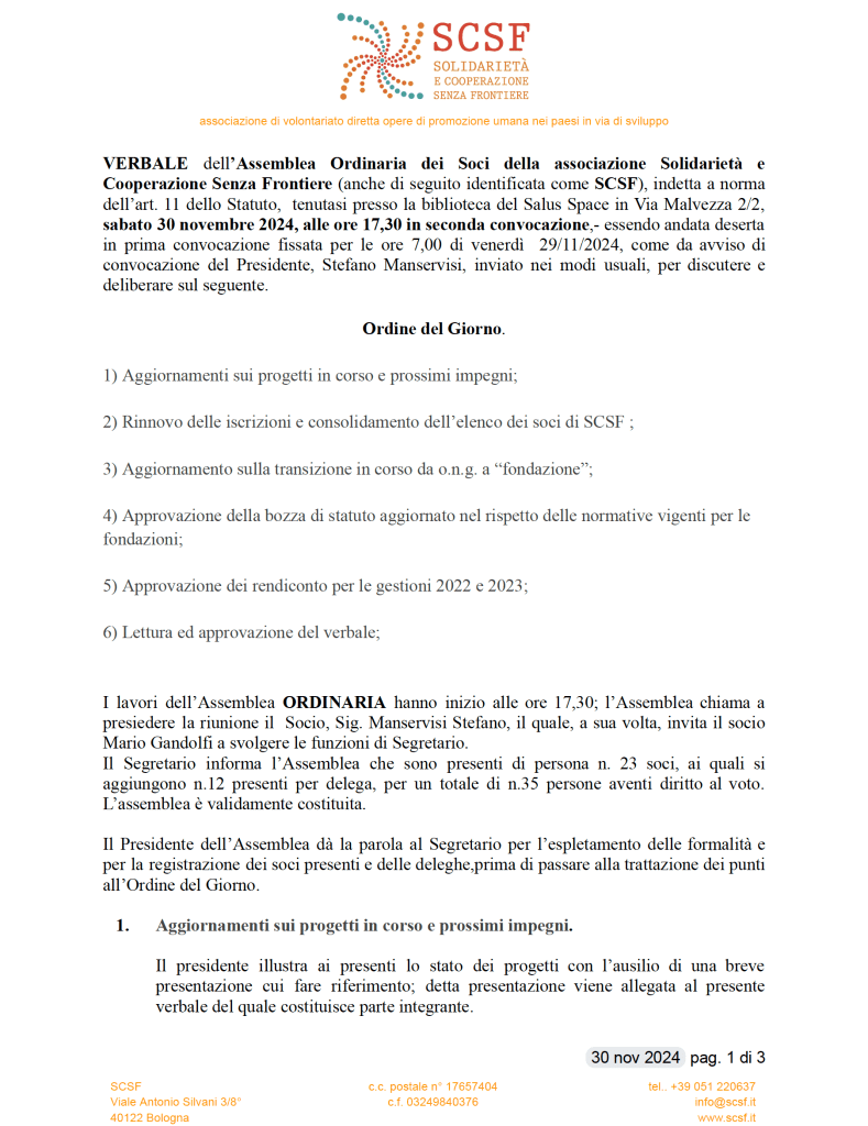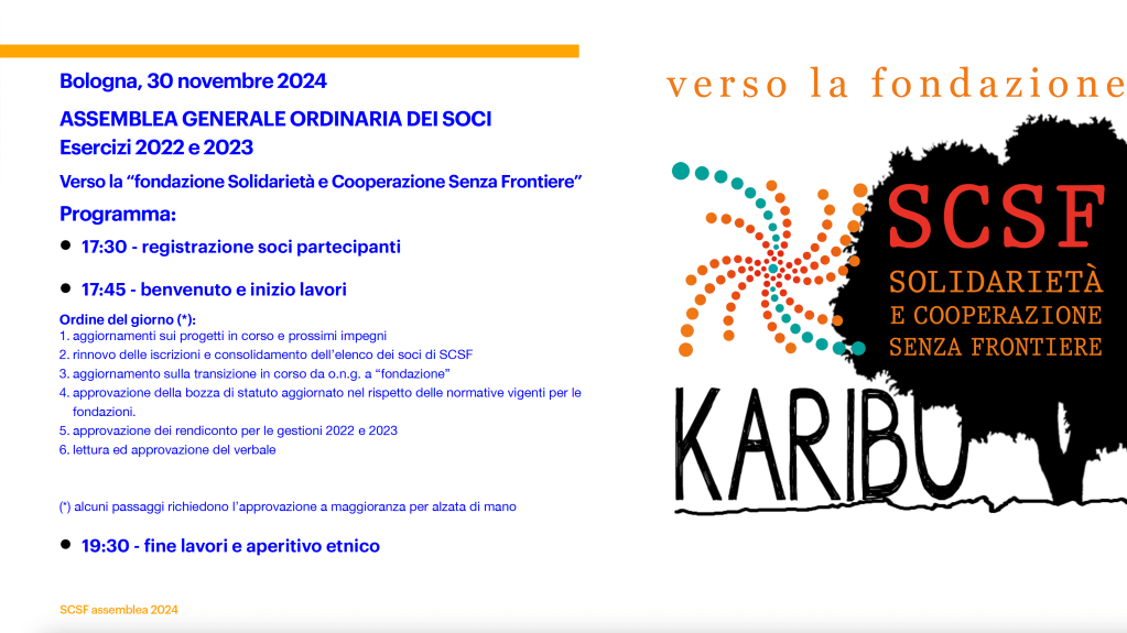 Si è tenuta sabato 30 novembre 2024 presso la biblioteca del Salus Space a Bologna la prima delle tre assemblee del percorso “verso la fondazione” che traghetterà la nostra associazione dalla attuale forma associativa verso la costituzione della “fondazione Solidarietà e Cooperazione Senza Frontiere” (più brevemente da ora in poi f.SCSF).